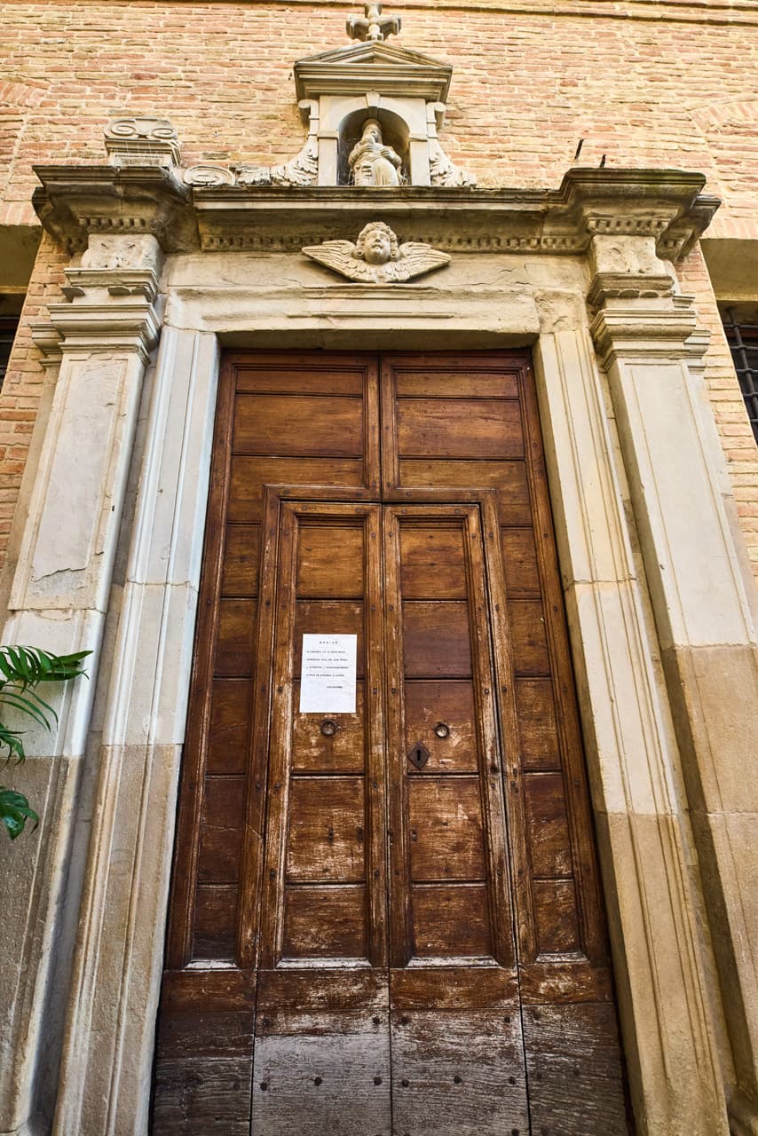 La suggestione borrominiana è rafforzata anche dalla presenza delle quattro porte laterali (dipinte a grottesche), dall’unico ordine di lesene e dalla forma ovale della cantoria. La comunità monastica del resto vantava rapporti consolidati fin dall’inizio del Seicento con i Padri Filippini del Convento romano di S. Filippo Neri, dove tra il 1637 ca. ed il 1660 ca. è attivo Borromini. Di particolare interesse sono gli arredi lignei, i cui ornamenti di elevata qualità artistica distinguono l’ambiente signorile del monastero. Un recente restauro ha restituito gli antichi materiali ed i colori originari attraverso l’eliminazione delle sovrastrutture accumulatesi nel corso dei secoli. La volta, scandita da decorazioni in stucco, è ornata al centro da un affresco (sec. XVIII) raffigurante S. Maria Maddalena portata in cielo dagli angeli. Ai lati, entro medaglioni con cornice in stucco, sono gli Evangelisti. Il dipinto collocato sull’altare maggiore, fu eseguito dal pittore fiammingo Ernst De Schaych (Utrecht, 1567-1631) nel 1617, durante un soggiorno marchigiano che lo portò a lavorare anche in altre località della regione. Si tratta di una raffigurazione della Madonna della Cintola, che rappresenta la Madonna in trono col Bambino che consegnano le cinture, simbolo dell’ordine agostiniano, a S. Agostino e S. Monica, attorniati da figure di re e regine, papi e vescovi, in riferimento al potere temporale e spirituale. In primo piano, nell’estremità inferiore del dipinto, sono i busti di quattro santi (S. Francesco, S. Maria Maddalena, S. Giuseppe e S. Bernardino da Siena). Al di sotto della data e della firma dell’artista, sono le iniziali e lo stemma della famiglia Innocenzi di Ostra Vetere, che commissionò il dipinto in occasione della nomina a madre vicaria di una nipote monaca presso il Monastero di S. Maria Maddalena. La tela dipinta nel 1668 dal ferrarese Clemente Maioli testimonia il passaggio dell’artista nelle Marche dopo il periodo di permanenza a Roma, dove è attivo a partire dal 1634, e prima del definitivo ritorno a Ferrara nel 1671 c.a., pochi anni prima della sua morte. L’opera collocata sull’altare di sinistra rappresenta l’Assunzione della Vergine, con la Madonna trasportata in cielo da un coro di angeli dinanzi agli Apostoli raccolti in preghiera intorno al sepolcro. L’equilibrata costruzione scenica dello spazio di chiara derivazione emiliana, insieme all’attenzione per la cultura veneta (Tintoretto), sono attinte da un’opera di Annibale Carracci dal medesimo soggetto, conservata presso la Pinacoteca Nazionale di Bologna. Sull’altare di destra è collocata una tela ascrivibile all’ambito della pittura locale della seconda metà del Seicento. Rappresenta la Madonna del Carmelo, con la Vergine incoronata ed il Bambino, mentre porge lo scapolare a Simon Stock, frate inglese fondatore dell’ordine carmelitano, mai ufficialmente canonizzato ma molto venerato nella chiesa cattolica. Secondo la tradizione, lo scapolare salva dal fuoco dell’inferno colui che lo indossa. Circondano la figura del frate S. Chiara, S. Bonaventura, S. Sebastiano e S. Pietro Martire, frate domenicano che subì il martirio nella lotta contro le eresie. In basso a mezzo busto sono raffigurati altri cinque santi: S. Caterina d’Alessandria, S. Lorenzo, S. Filippo Neri, S. Nicola da Tolentino e S. Agata. Dietro l’altare principale è visibile, attraverso una grata dorata, l’organo Andrea Gennari del 1827/1828, restaurato nel 2001 e tutt’ora funzionante. L’organo alloggia al suo interno un tamburo e dei campanelli, come spesso accadeva per gli organi italiani del diciannovesimo secolo.